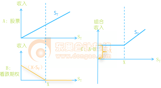 股票加看跌期權(quán)組合,稱為保護(hù)性看跌期權(quán)。是指購買1份股票,同時(shí)購買該股票1份看跌期權(quán)。
