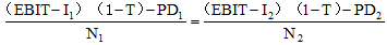 要點(diǎn) 內(nèi)容 基本觀點(diǎn) 能提高每股收益的資本結(jié)構(gòu)是合理的,反之則不夠合理。 關(guān)鍵指標(biāo) 每股收益無(wú)差別點(diǎn):是指每股收益不受融資方式影響的EBIT水平。 【相關(guān)鏈接】有時(shí)考試中會(huì)特指用銷(xiāo)售收入來(lái)表示,則此時(shí)每股收益無(wú)差別點(diǎn),是指每股收益不受融資方式影響的銷(xiāo)售水平。 每股收益的無(wú)差別點(diǎn)的計(jì)算公式 決策原則 當(dāng)息前稅前利潤(rùn)大于每股收益無(wú)差別點(diǎn)的息前稅前利潤(rùn)時(shí),運(yùn)用負(fù)債籌資可獲得較高的每股收益;反之運(yùn)用權(quán)益籌資可獲得較高的每股收益。 方法的缺點(diǎn) 沒(méi)有考慮風(fēng)險(xiǎn)因素。