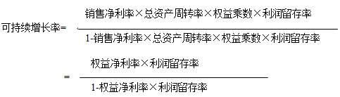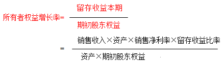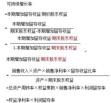 =銷售凈利率×總資產(chǎn)周轉(zhuǎn)率×期初權(quán)益期末總資產(chǎn)乘數(shù)×收益留存率