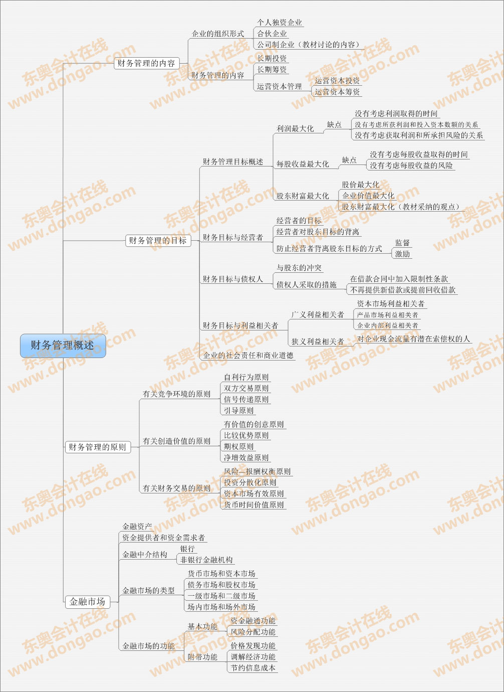 【東奧小編】2014年注冊(cè)會(huì)計(jì)師考試正式進(jìn)入基礎(chǔ)備考階段,注會(huì)知識(shí)點(diǎn)繁雜細(xì)碎,想要全面掌握注會(huì)各科目的知識(shí),需要科學(xué)高效的學(xué)習(xí)方法,思維導(dǎo)圖正是一種非常適合注會(huì)復(fù)習(xí)的學(xué)習(xí)方法,正確利用思維導(dǎo)圖,不僅能使自己積極進(jìn)行知識(shí)點(diǎn)總結(jié),形成清晰的思路,還能對(duì)知識(shí)點(diǎn)進(jìn)行快速查漏補(bǔ)缺。以下是2014注會(huì)《財(cái)務(wù)成本管理》第一章財(cái)務(wù)管理概述思維導(dǎo)圖: