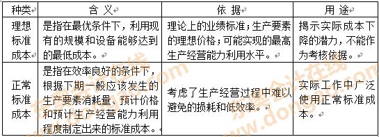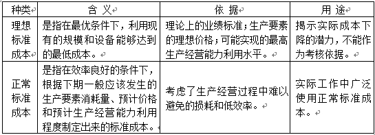 (一)標(biāo)準(zhǔn)成本按其制定所根據(jù)的生產(chǎn)技術(shù)和經(jīng)營(yíng)管理水平,分為理想標(biāo)準(zhǔn)成本和正常標(biāo)準(zhǔn)成本。