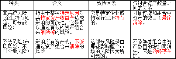 【提示1】可以通過(guò)增加組合中資產(chǎn)的數(shù)目而最終消除的風(fēng)險(xiǎn)被稱為非系統(tǒng)風(fēng)險(xiǎn),而那些反映資產(chǎn)之間相互關(guān)系,共同運(yùn)動(dòng),無(wú)法最終消除的風(fēng)險(xiǎn)被稱為系統(tǒng)風(fēng)險(xiǎn)。