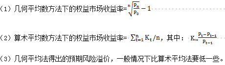(1)算術(shù)平均數(shù)的理由:更符合資本資產(chǎn)定價模型中的平均方差結(jié)構(gòu) (2)幾何平均數(shù)的理由:考慮了復(fù)合平均,能更好地預(yù)測長期的平均風險溢價。 多數(shù)人傾向于采用幾何平均法。 |
