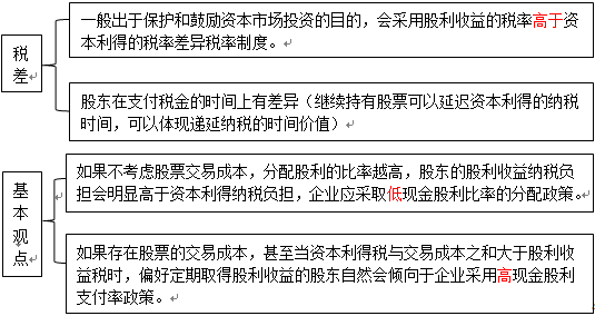 【提示】稅差理論說明了當(dāng)股利收益稅率與資本利得稅率存在差異時(shí),將使股東在繼續(xù)持有股票以期取得預(yù)期資本利得與立即實(shí)現(xiàn)股利收益之間進(jìn)行權(quán)衡。