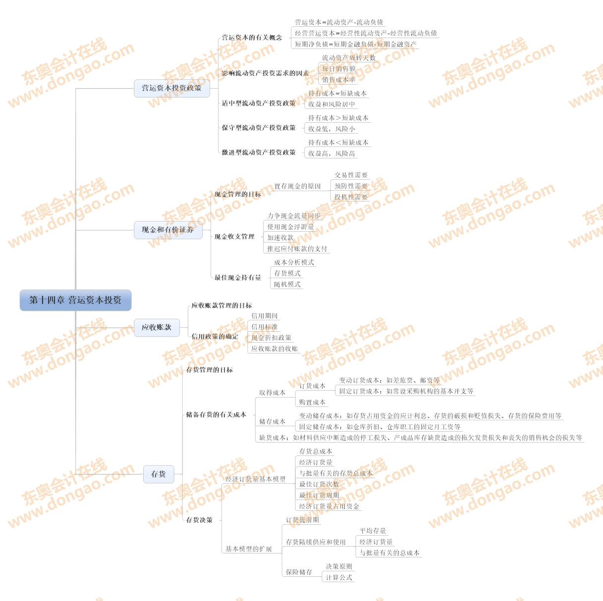 【東奧小編】2014年注冊(cè)會(huì)計(jì)師考試正式進(jìn)入基礎(chǔ)備考階段,注會(huì)知識(shí)點(diǎn)繁雜細(xì)碎,想要全面掌握注會(huì)各科目的知識(shí),需要科學(xué)高效的學(xué)習(xí)方法,思維導(dǎo)圖正是一種非常適合注會(huì)復(fù)習(xí)的學(xué)習(xí)方法,正確利用思維導(dǎo)圖,不僅能使自己積極進(jìn)行知識(shí)點(diǎn)總結(jié),形成清晰的思路,還能對(duì)知識(shí)點(diǎn)進(jìn)行快速查漏補(bǔ)缺。以下是2014注會(huì)《財(cái)務(wù)成本管理》第十四章營運(yùn)資本投資思維導(dǎo)圖: