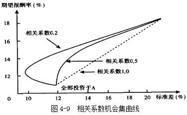 證券報酬率的相關系數(shù)越小,機會集曲線就越彎曲,風險分散化效應也就越強。 |