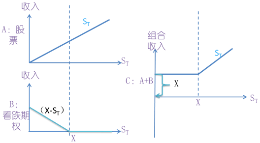 股票加看跌期權(quán)組合,稱為保護(hù)性看跌期權(quán)。是指購買1份股票,同時購買該股票1份看跌期權(quán)。