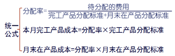 【提示】公式前兩項之和為待分配費用,待分配費用在完工產(chǎn)品與月末在產(chǎn)品之間分配有兩類方法:一是“倒擠法”,即先確定月末在產(chǎn)品成本,再用待分配費用減月末在產(chǎn)品成本得出完工產(chǎn)品的成本;二是“分配法”,即將待分配費用按一定比例在完工產(chǎn)品與月末在產(chǎn)品之間進行分配。