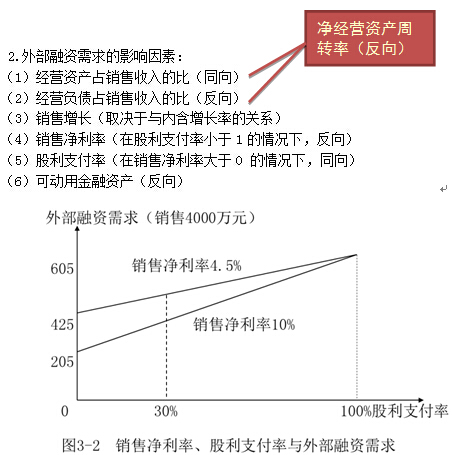 外部融資需求=增加的銷售收入×經營資產銷售百分比-增加的銷售收入×經營負債銷售百分比-可以動用的金融資產-預計銷售額×計劃銷售凈利率×(1-股利支付率)