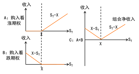 多頭對敲是指同時買進一只股票的看漲期權和看跌期權,它們的執(zhí)行價格、到期日都相同。