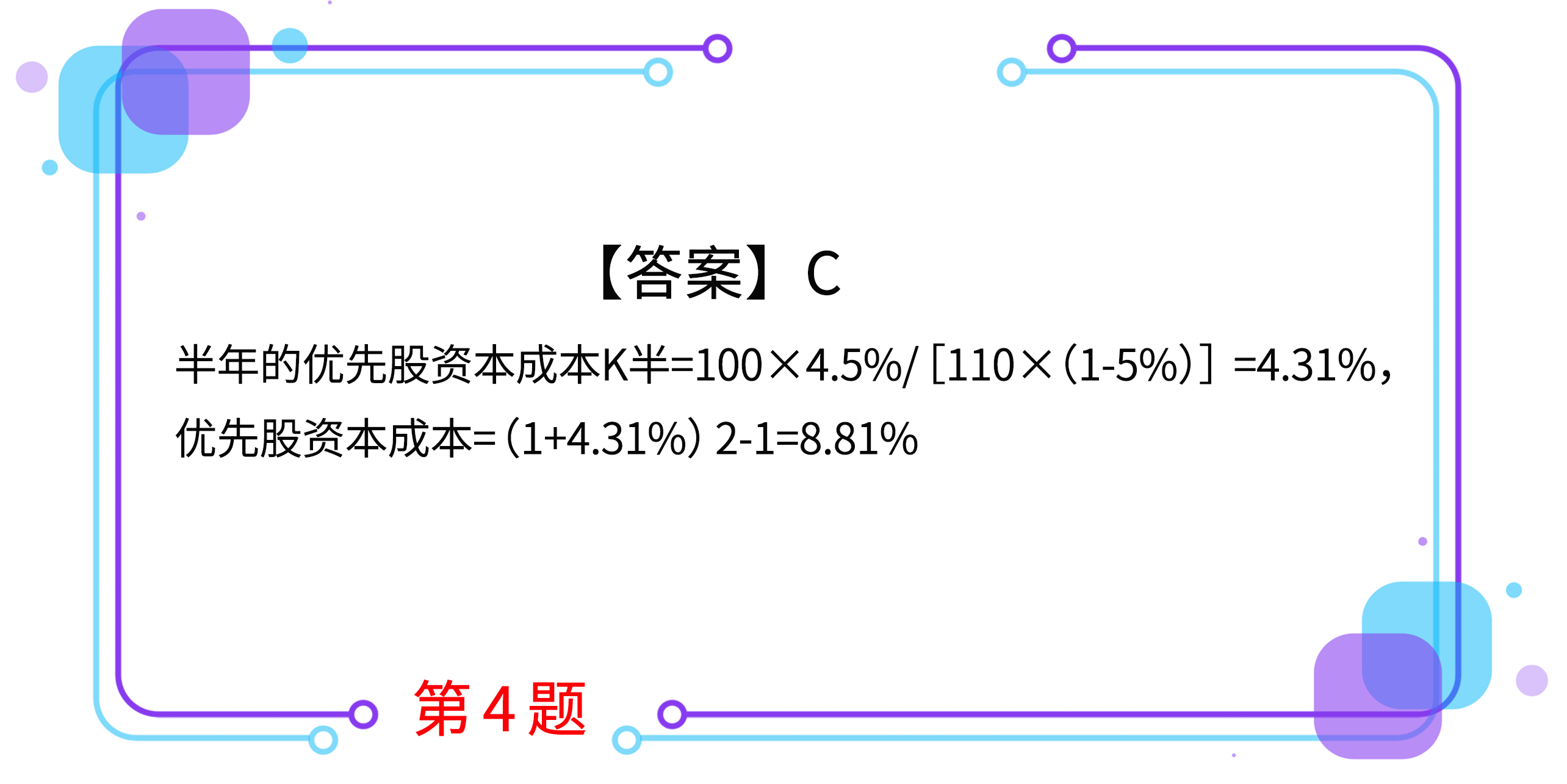 4.某企業(yè)經(jīng)批準(zhǔn)溢價(jià)發(fā)行優(yōu)先股股票,每股面值100元,發(fā)行價(jià)格110元,發(fā)行費(fèi)用率和年股息率分別為5%和9%,每半年支付一次股利,所得稅稅率為25%,則優(yōu)先股資本成本為( )。