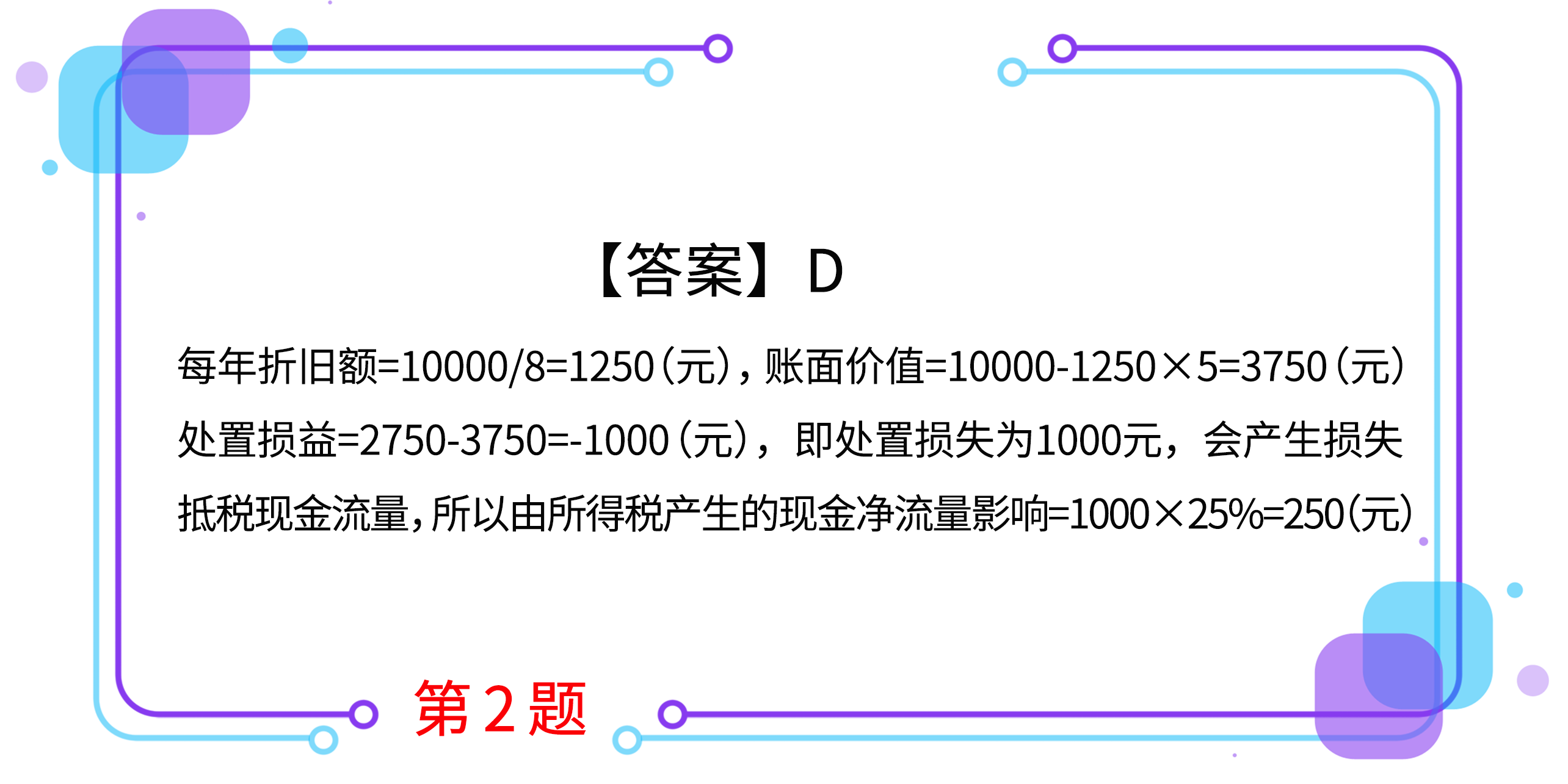 2.年末A公司正在考慮賣掉現(xiàn)有的一臺閑置設(shè)備,該設(shè)備5年前以10000元購入,稅法規(guī)定使用年限為8年,按直線法計(jì)提折舊,無殘值。目前可以按2750元價(jià)格賣出,A公司適用的所得稅稅率為25%,則賣出該閑置設(shè)備時(shí)由所得稅產(chǎn)生的現(xiàn)金凈流量影響是( )元。