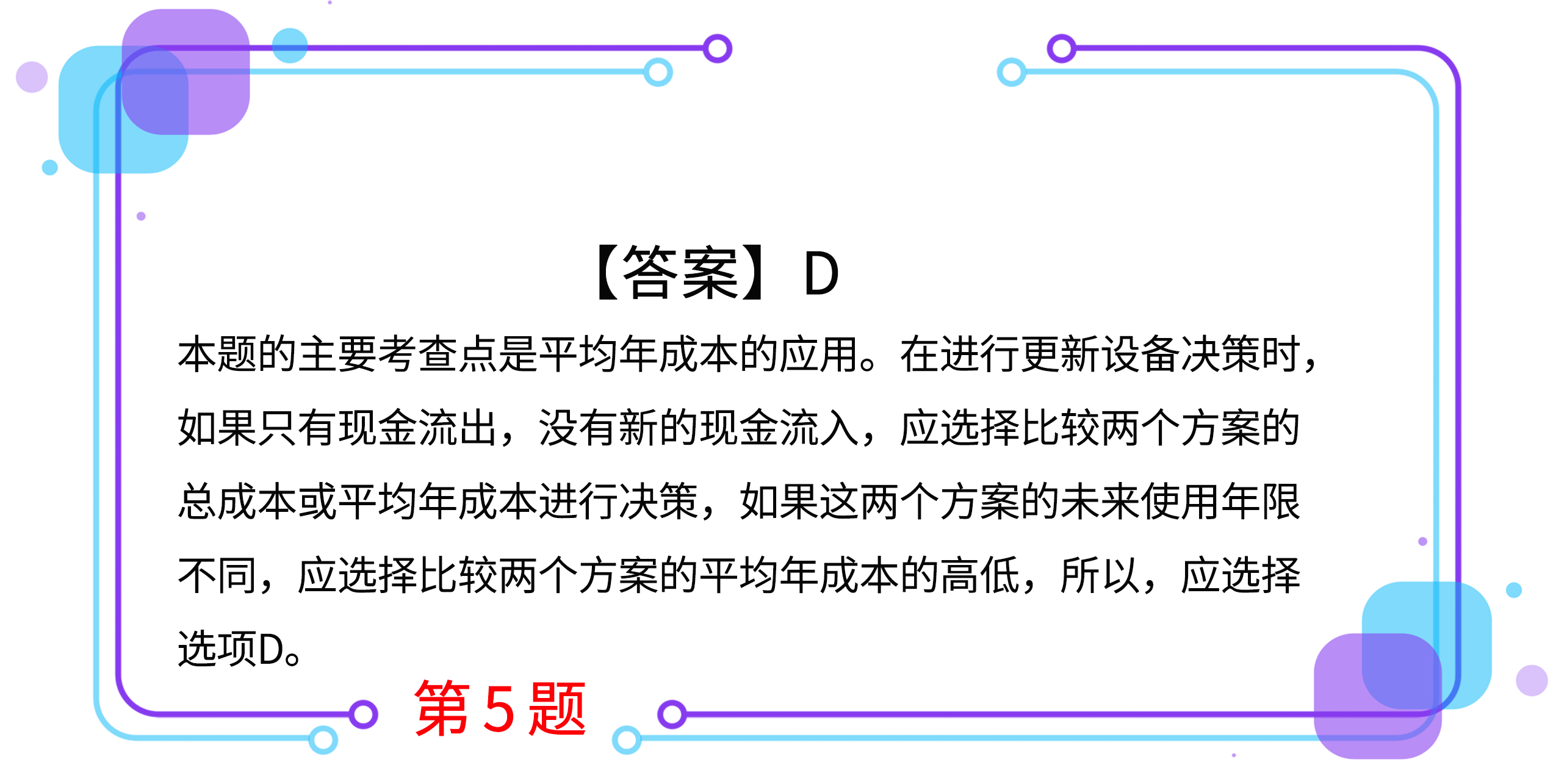 5.在進(jìn)行是繼續(xù)使用舊設(shè)備還是購置新設(shè)備決策時(shí),如果這兩個(gè)方案的未來使用年限不同,且只有現(xiàn)金流出,沒有新的現(xiàn)金流入。則最為合適的評價(jià)方法是( )。