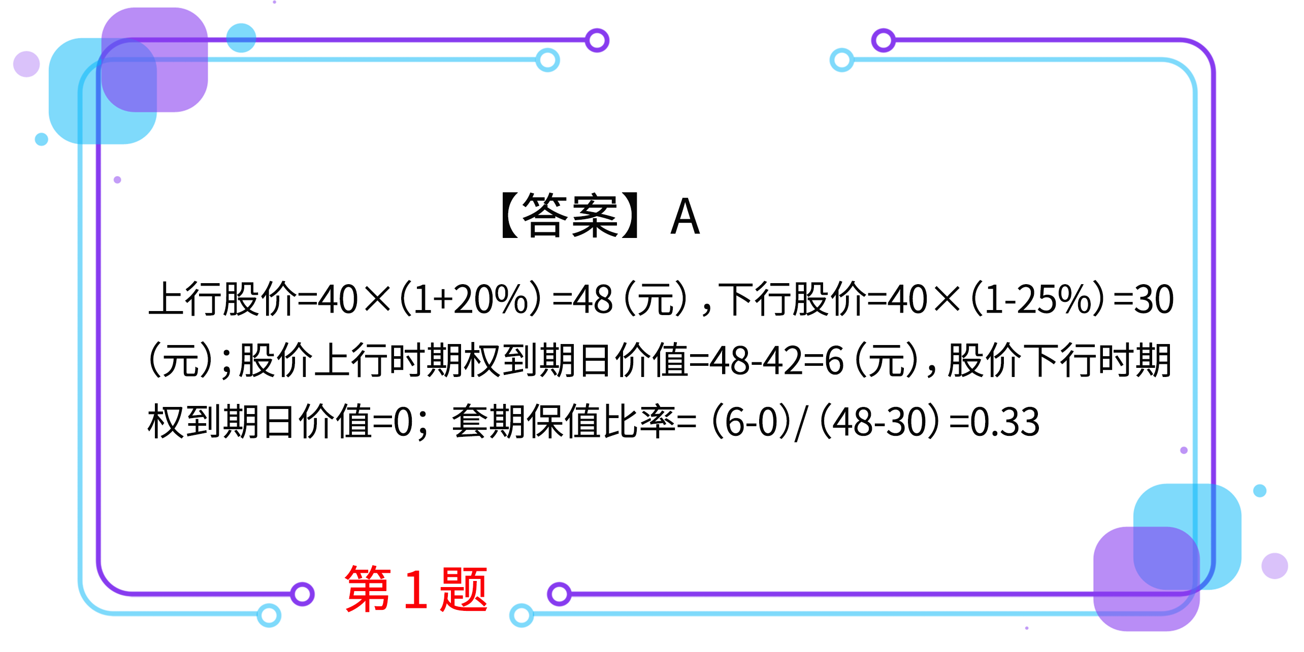 1.某公司股票目前的市價為40元,有1份以該股票為標(biāo)的資產(chǎn)的歐式看漲期權(quán)(1份期權(quán)包含1股標(biāo)的股票),執(zhí)行價格為42元,到期時間為6個月。6個月以后股價有兩種可能:上升20%或者下降25%,則套期保值比率為( )。