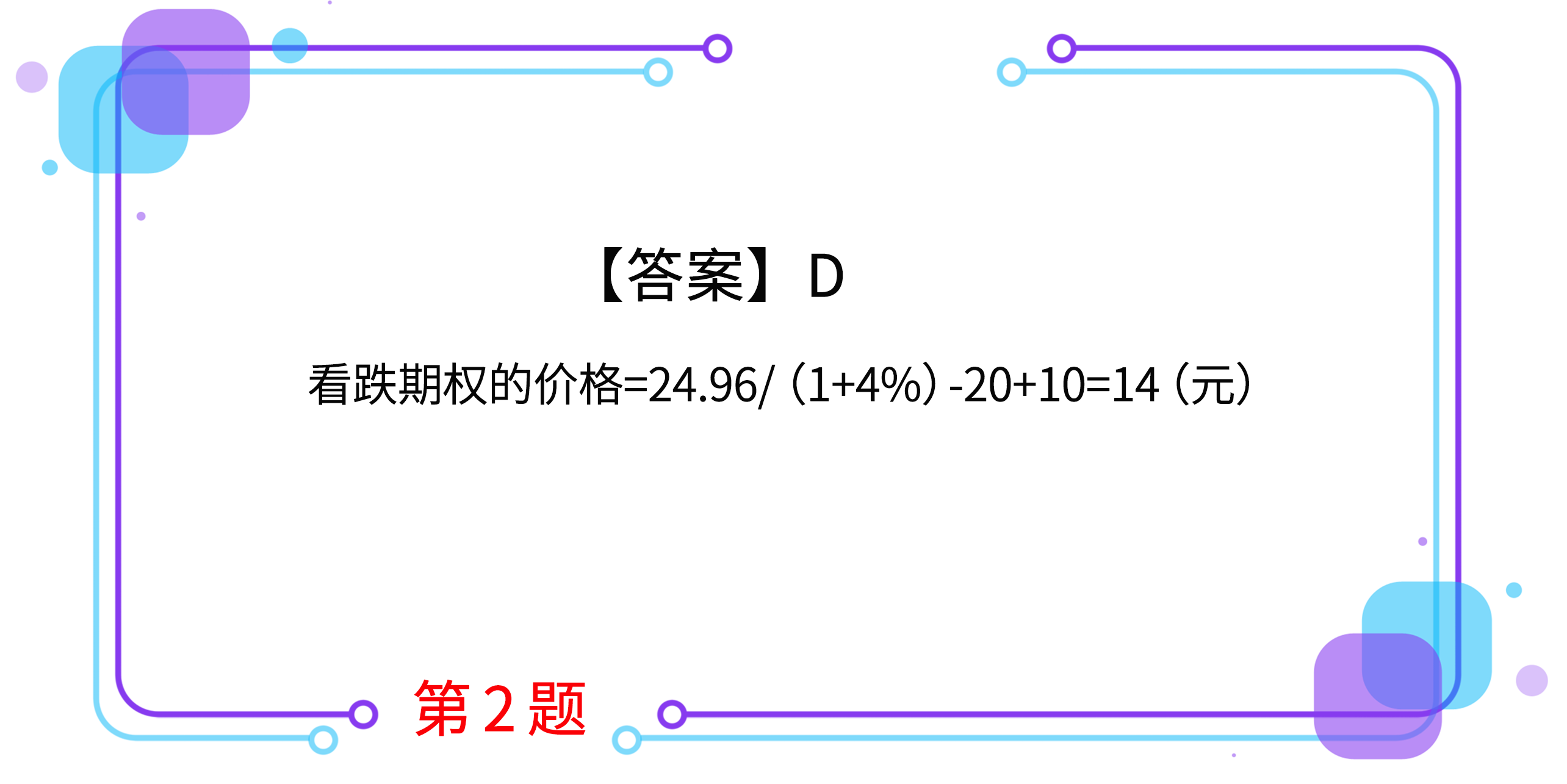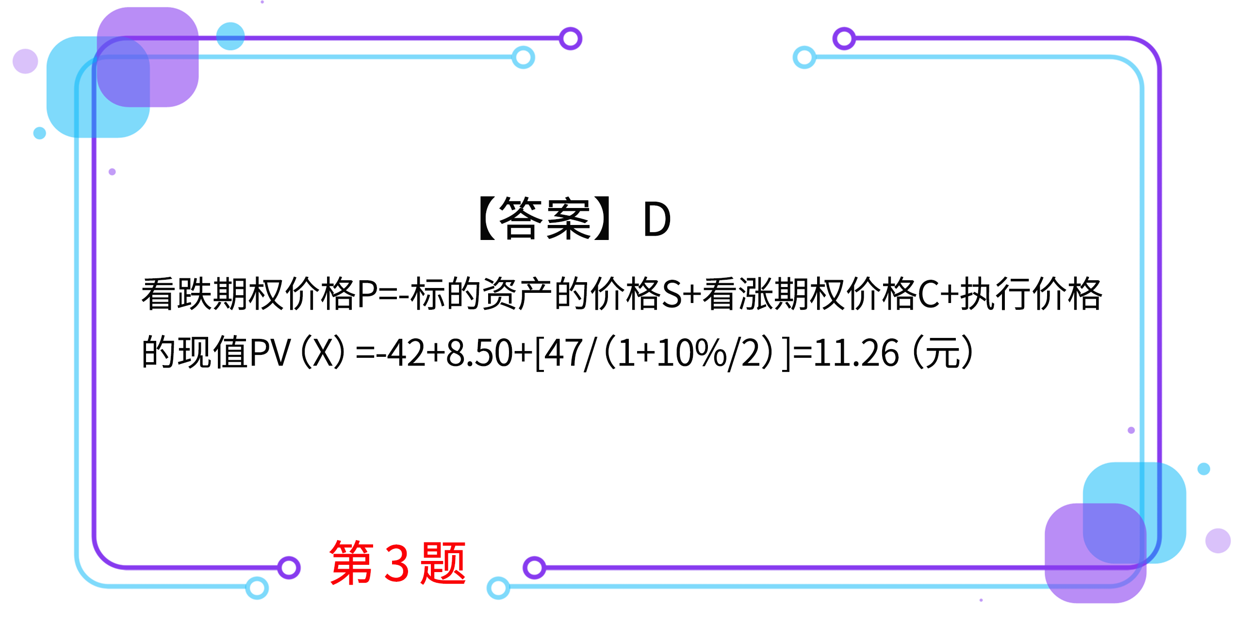 3.標(biāo)的股票為同一股票的歐式看漲期權(quán)和歐式看跌期權(quán)的執(zhí)行價格均為47元,6個月到期,若無風(fēng)險名義年利率為10%,股票的現(xiàn)行價格為42元,看漲期權(quán)的價格為8.50元,則看跌期權(quán)的價格為( )元。