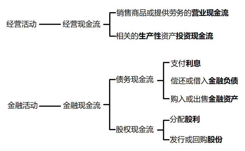 經(jīng)營(yíng)現(xiàn)金流量 (實(shí)體現(xiàn)金流量) | 指企業(yè)因銷售商品或提供勞務(wù)等營(yíng)業(yè)活動(dòng)以及與此有關(guān)的生產(chǎn)性資產(chǎn)投資活動(dòng)產(chǎn)生的現(xiàn)金流量 | 站在企業(yè)實(shí)體的角度,流入為正,流出為負(fù) |