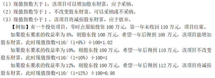 概念 | 【教材】現(xiàn)值指數(shù)是指投資項(xiàng)目未來現(xiàn)金凈流量現(xiàn)值與原始投資額現(xiàn)值的比值 |