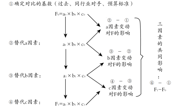 因素分析法 | 是依據(jù)財(cái)務(wù)指標(biāo)與其驅(qū)動(dòng)因素之間的關(guān)系,從數(shù)量上確定各因素對(duì)指標(biāo)影響程度的一種方法 | (1)連環(huán)替代法 設(shè)F=a×b×c 基數(shù)(計(jì)劃、上年、同行業(yè)先進(jìn)水平) F0=a0×b0×c0 實(shí)際F1=a1×b1×c1 (2)差額分析法 a因素變動(dòng)對(duì)F的影響:(a1-a0)×b0×c0 b因素變動(dòng)對(duì)F的影響:a1×(b1-b0)×c0 c因素變動(dòng)對(duì)F的影響:a1×b1×(c1-c0) 注意連環(huán)替代的順序,一般題中都會(huì)有說(shuō)明 |