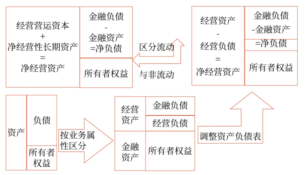 區(qū)分經營資產和金融資產、經營負債和金融負債,所有者權益不變。