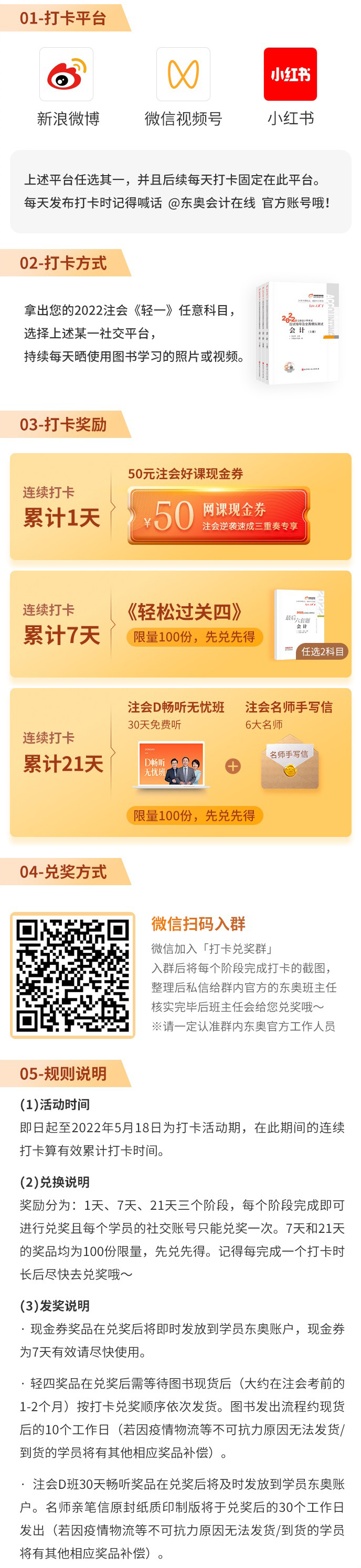 2022年注冊會計師備考已經開始,輕一一如既往備受考生信賴!正所謂“鍥而不舍,金石可鏤。”成功需要日復一日的堅持!東奧會計在線邀請各位考生參與「曬注會輕一」打卡活動,一起來堅持每日打卡,共同進步!考生們可以將使用輕一(紙質版、電子版均可)的備考日常發(fā)布到微博、視頻號及小紅書,并與東奧官方賬號進行互動,連續(xù)打卡1天、7天、21天就有機會獲得優(yōu)厚大禮!具體參與形式請見下文!