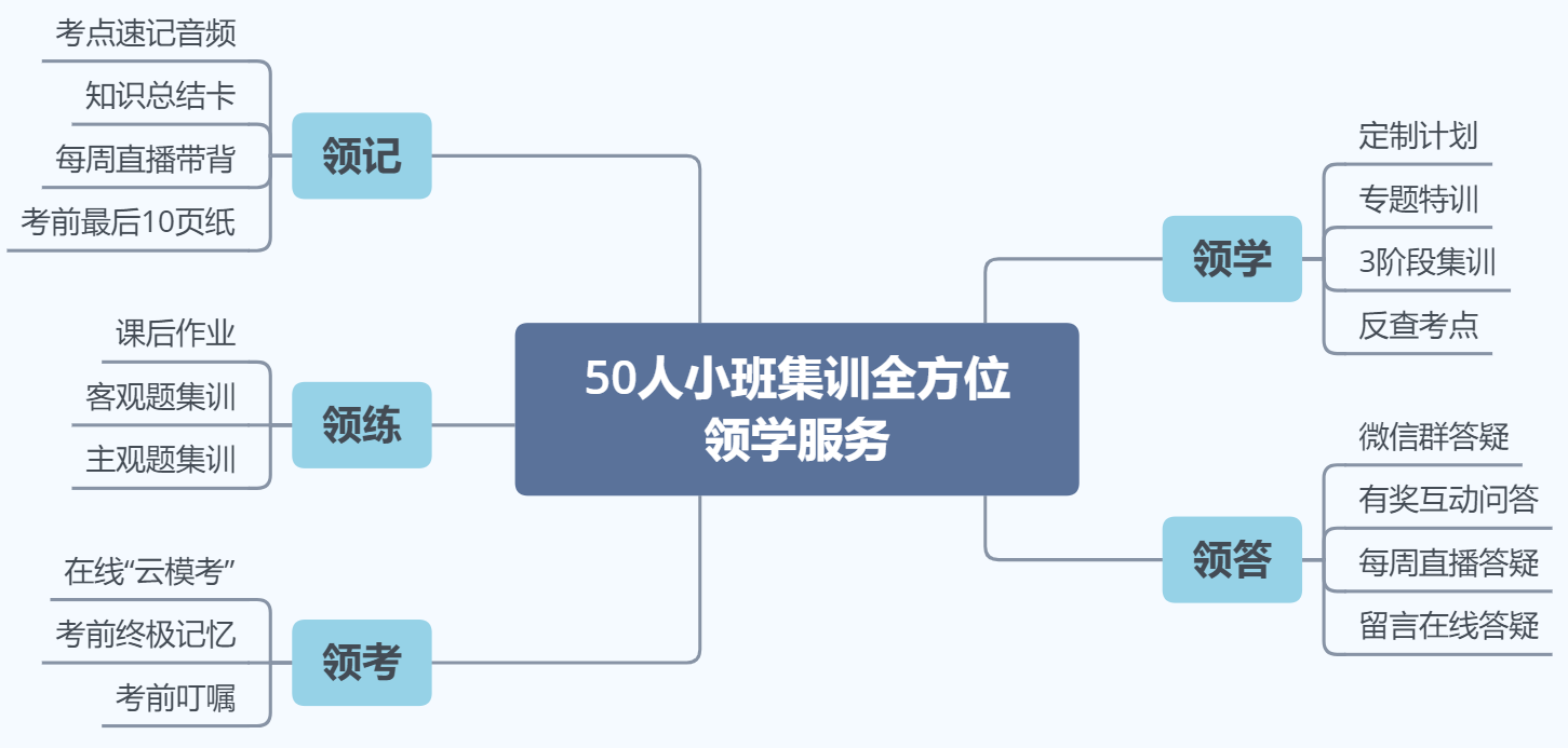 3階段集訓:25天基礎(chǔ)集訓班+10天客、主觀題集訓+10天沖刺集訓營。
