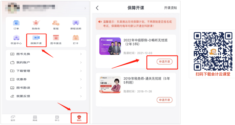 ■ 申請(qǐng)流程:打開會(huì)計(jì)云課堂→我的→保障開課→申請(qǐng)開課→人臉識(shí)別驗(yàn)證后→開課成功