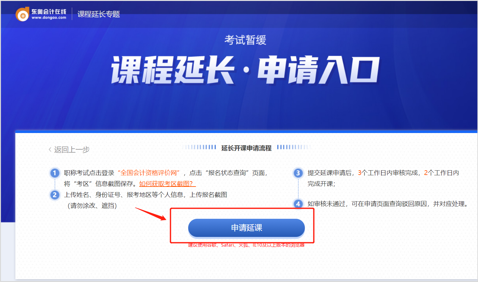 ■ 申請(qǐng)流程:登陸延期網(wǎng)址→選擇對(duì)應(yīng)考種入口→申請(qǐng)延課→填寫報(bào)考地區(qū)及個(gè)人信息→提交申請(qǐng)→3個(gè)工作日審核、審核成功后2個(gè)工作日開課成功(詳見下圖)