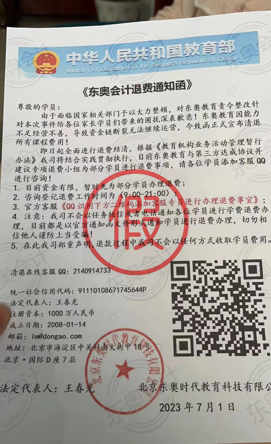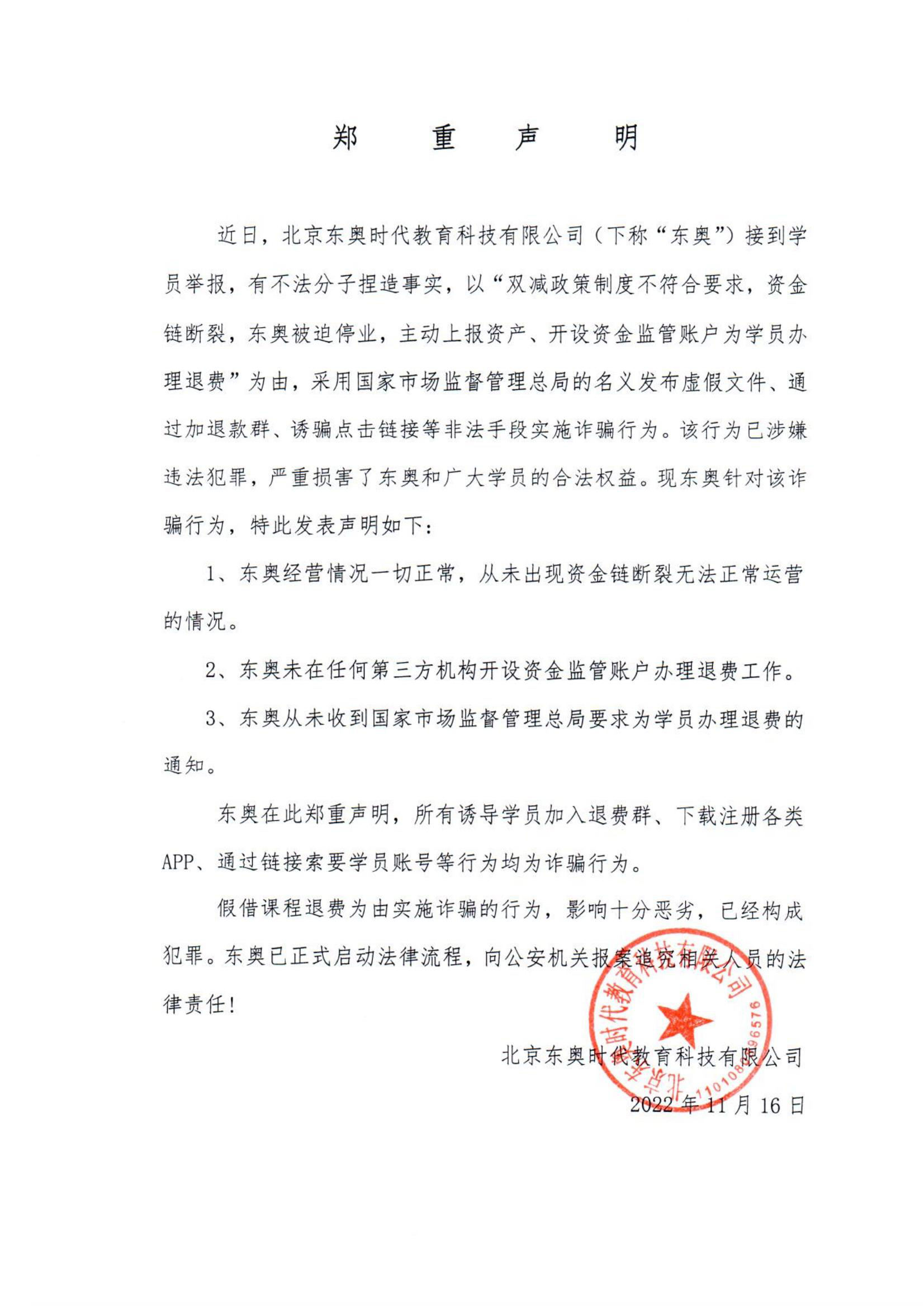 近日,北京東奧時(shí)代教育科技有限公司(下稱“東奧”)接到學(xué)員舉報(bào),有不法分子捏造事實(shí),以“雙減政策制度不符合要求,資金鏈斷裂,東奧被迫停業(yè),主動(dòng)上報(bào)資產(chǎn)、開設(shè)資金監(jiān)管賬戶為學(xué)員辦理退費(fèi)”為由,采用國(guó)家市場(chǎng)監(jiān)督管理總局的名義發(fā)布虛假文件、通過加退款群、誘騙點(diǎn)擊鏈接等非法手段實(shí)施詐騙行為。該行為已涉嫌違法犯罪,嚴(yán)重?fù)p害了東奧和廣大學(xué)員的合法權(quán)益?,F(xiàn)東奧針對(duì)該詐騙行為,特此發(fā)表聲明如下: