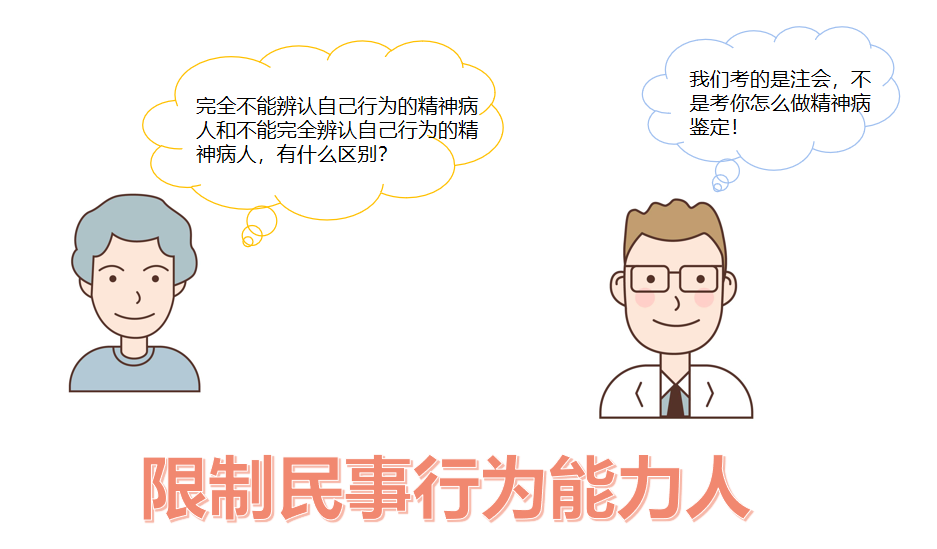 5.關于完全不能辨認自己行為的精神病人和不能完全辨認自己行為的精神病人,考生不要老是問如何區(qū)分這兩種情況,我們考的是注會,不是考你怎么做精神病鑒定。(限制民事行為能力人)