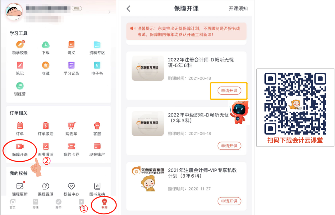 申請流程:打開會計(jì)云課堂→我的→保障開課→申請開課→人臉識別驗(yàn)證后→開課成功