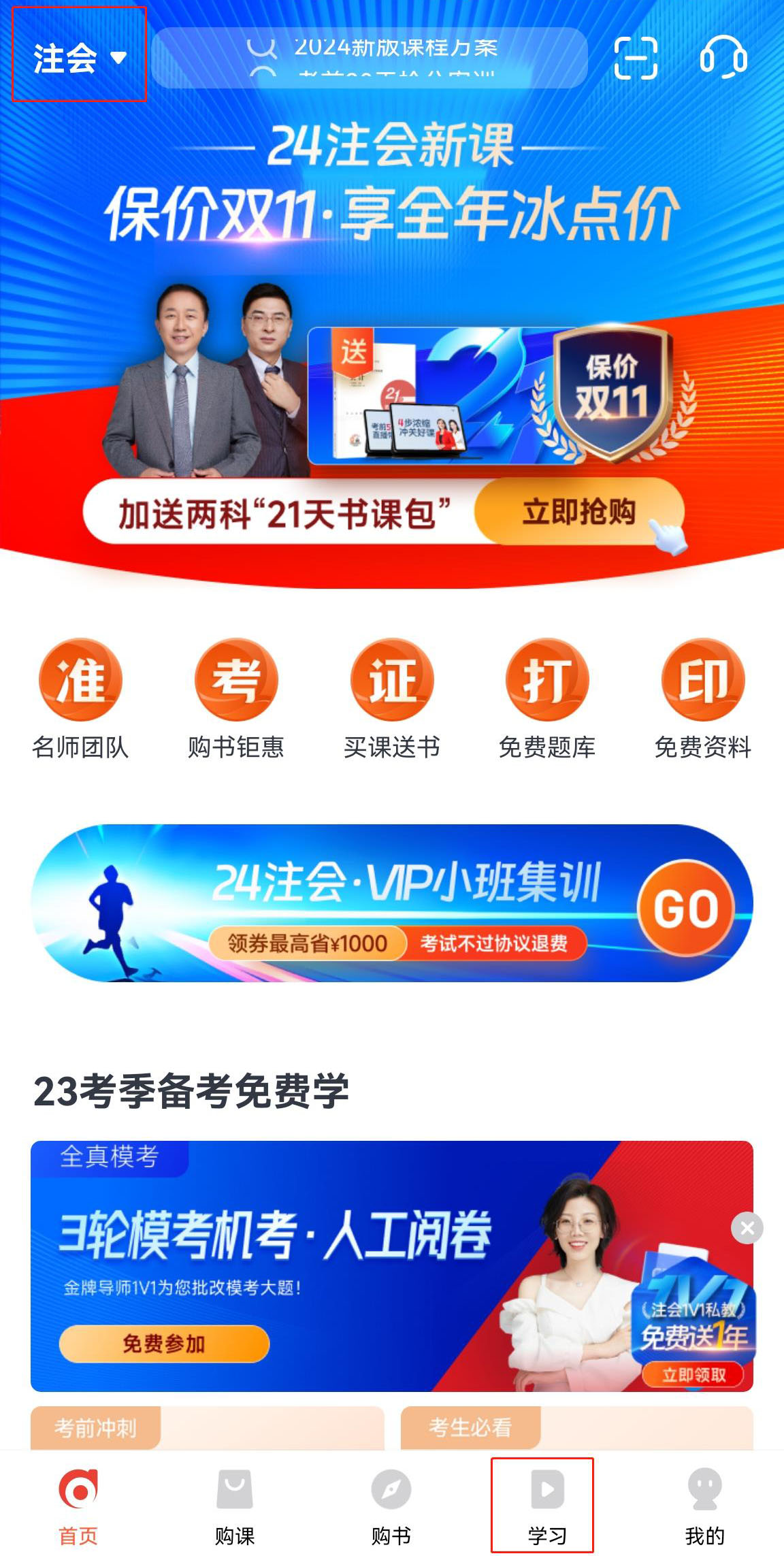 步驟一:登錄“會計云課堂”app,左上角選擇注會頻道,下方切換至“學(xué)習(xí)”頁面
