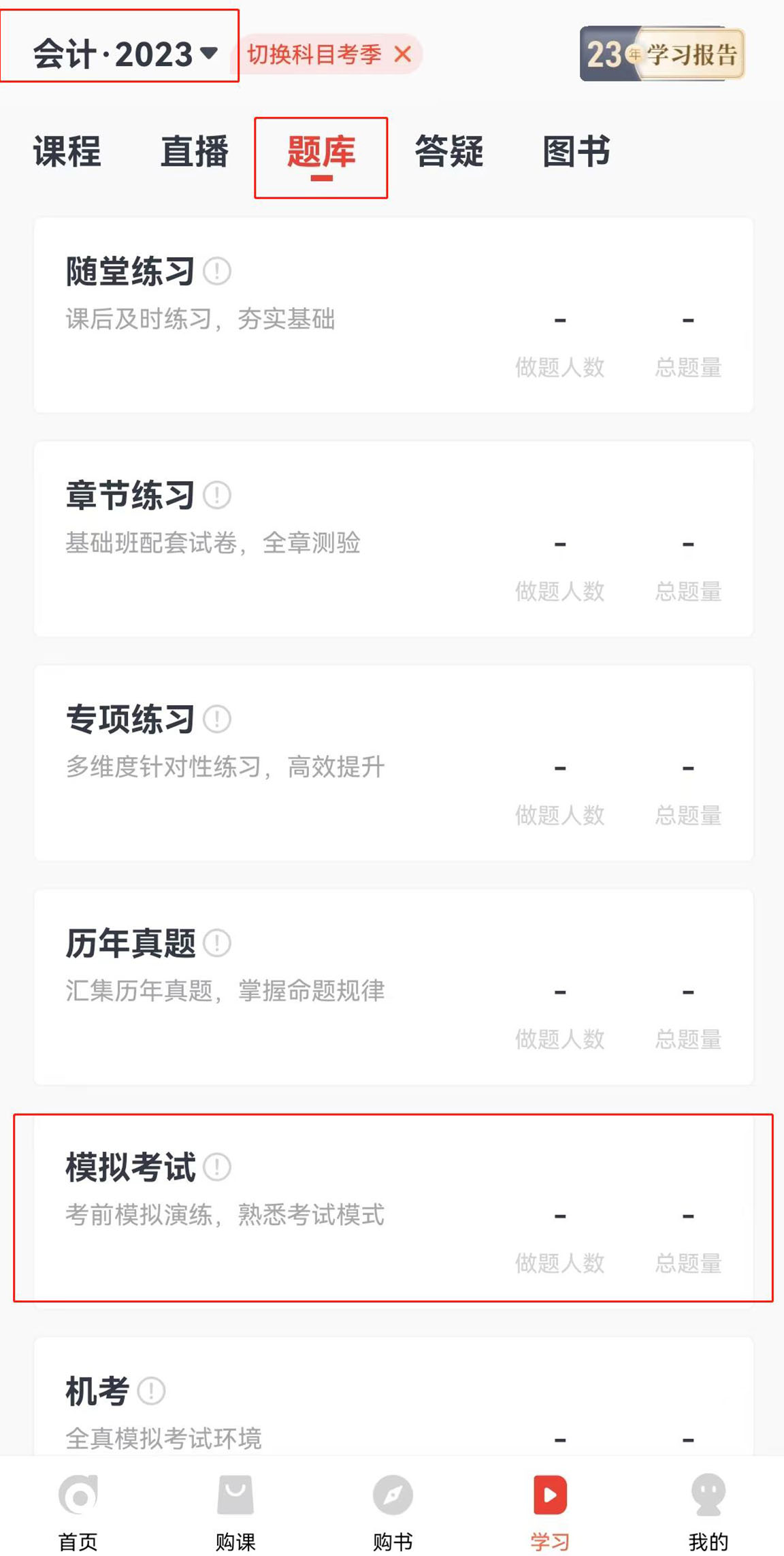步驟二:選擇對應(yīng)科目,切換至題庫欄目,點(diǎn)擊“模擬考試”