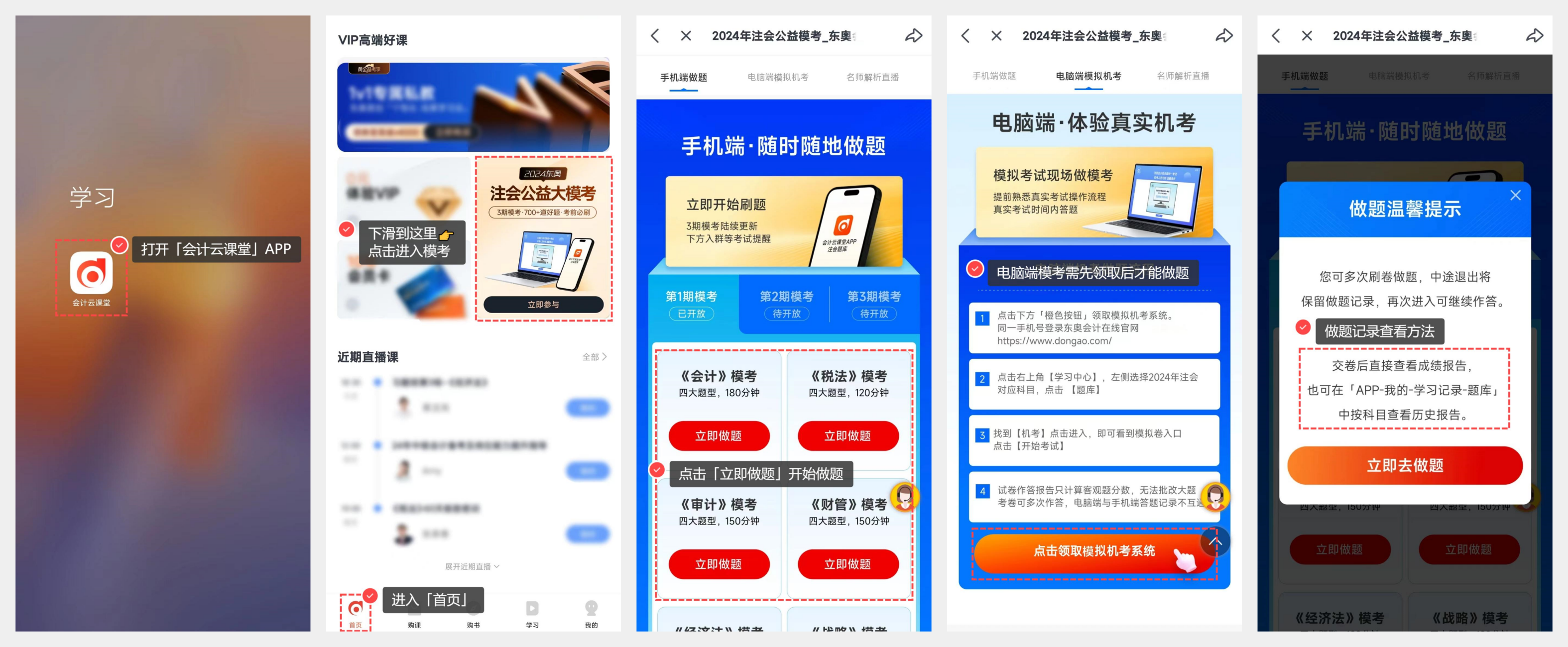 下載【會(huì)計(jì)云課堂】APP,進(jìn)入【首頁】下滑屏幕找到【注會(huì)公益大模考】,點(diǎn)擊【點(diǎn)擊領(lǐng)取模擬機(jī)考系統(tǒng)】按鈕,即可做題。考生可多次刷卷做題,中途退出后將保留做題記錄,再次進(jìn)入繼續(xù)作答。點(diǎn)擊下圖查看步驟圖解!