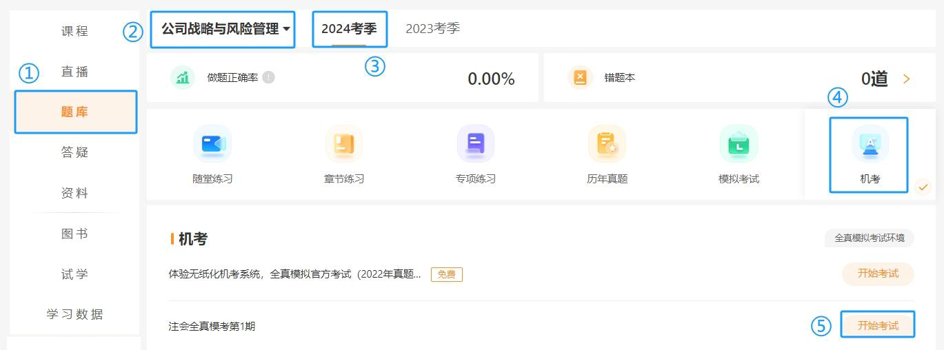 領(lǐng)卷后,考生可進(jìn)入東奧【學(xué)習(xí)中心】完成機(jī)考。進(jìn)入【學(xué)習(xí)中心】后在左側(cè)菜單選擇【題庫】,篩選考試【科目】和【考季】,找到【機(jī)考】點(diǎn)擊進(jìn)入,而后點(diǎn)擊【開始考試】。點(diǎn)擊下圖查看步驟圖解!學(xué)習(xí)中心點(diǎn)擊進(jìn)入>>