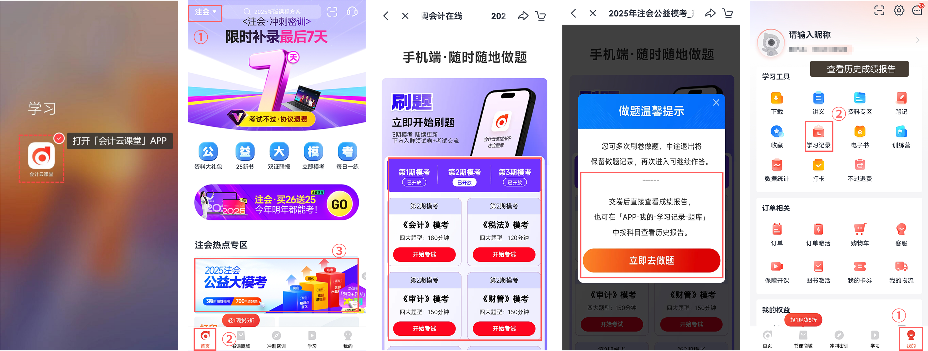 下載【會計云課堂】APP,選擇注會考種,進入【首頁】下滑屏幕找到【注會公益大??肌浚c擊【點擊領取模擬機考系統(tǒng)】按鈕,即可做題??忌啥啻嗡⒕碜鲱},中途退出后將保留做題記錄,再次進入繼續(xù)作答。點擊下圖查看步驟圖解!