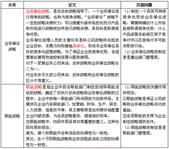 公司戰(zhàn)略分為三個(gè)層次:總體戰(zhàn)略、業(yè)務(wù)單位戰(zhàn)略(或競(jìng)爭(zhēng)戰(zhàn)略)、職能戰(zhàn)略。