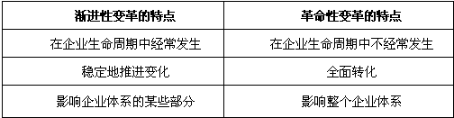 1.根據(jù)變革的程度不同,目前理論界比較普遍認同的變革有漸進性變革和革命性變革兩種。