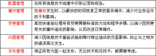 信息技術(shù)基礎(chǔ)設(shè)施庫通過規(guī)劃指導(dǎo)商業(yè)用戶,以商業(yè)需求來提供和管理信息技術(shù)服務(wù)的質(zhì)量。五個(gè)服務(wù)支持的流程和目標(biāo)是:
