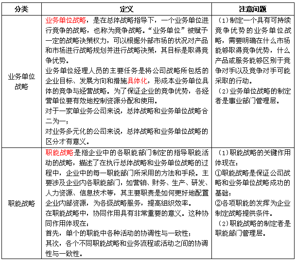 公司戰(zhàn)略分為三個(gè)層次:總體戰(zhàn)略、業(yè)務(wù)單位戰(zhàn)略(或競(jìng)爭(zhēng)戰(zhàn)略)、職能戰(zhàn)略。