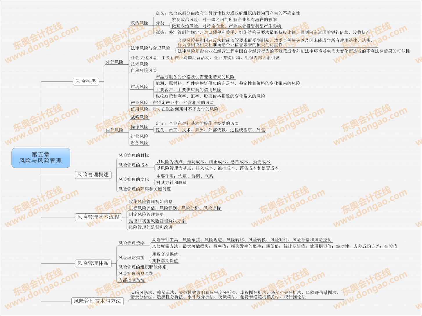【東奧小編】2014年注冊會計師考試目前處于基礎(chǔ)備考階段,注會知識點繁雜細(xì)碎,想要全面掌握注會各科目的知識,需要科學(xué)高效的學(xué)習(xí)方法,思維導(dǎo)圖正是一種非常適合注會復(fù)習(xí)的學(xué)習(xí)方法,正確利用思維導(dǎo)圖,不僅能使自己積極進行知識點總結(jié),形成清晰的思路,還能對知識點進行快速查漏補缺。以下是2014注會《公司戰(zhàn)略與風(fēng)險管理》第五章風(fēng)險與風(fēng)險管理思維導(dǎo)圖: