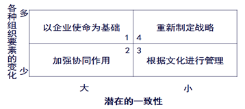 在第四象限,企業(yè)在處理戰(zhàn)略與文化的關(guān)系時,遇到了極大的挑戰(zhàn)。企業(yè)在實施一個新戰(zhàn)略時,組織的要素會發(fā)生重大的變化,又多與企業(yè)現(xiàn)有的文化很不一致,或受到現(xiàn)有文化的抵制。對于企業(yè)來講,這是個兩難問題。