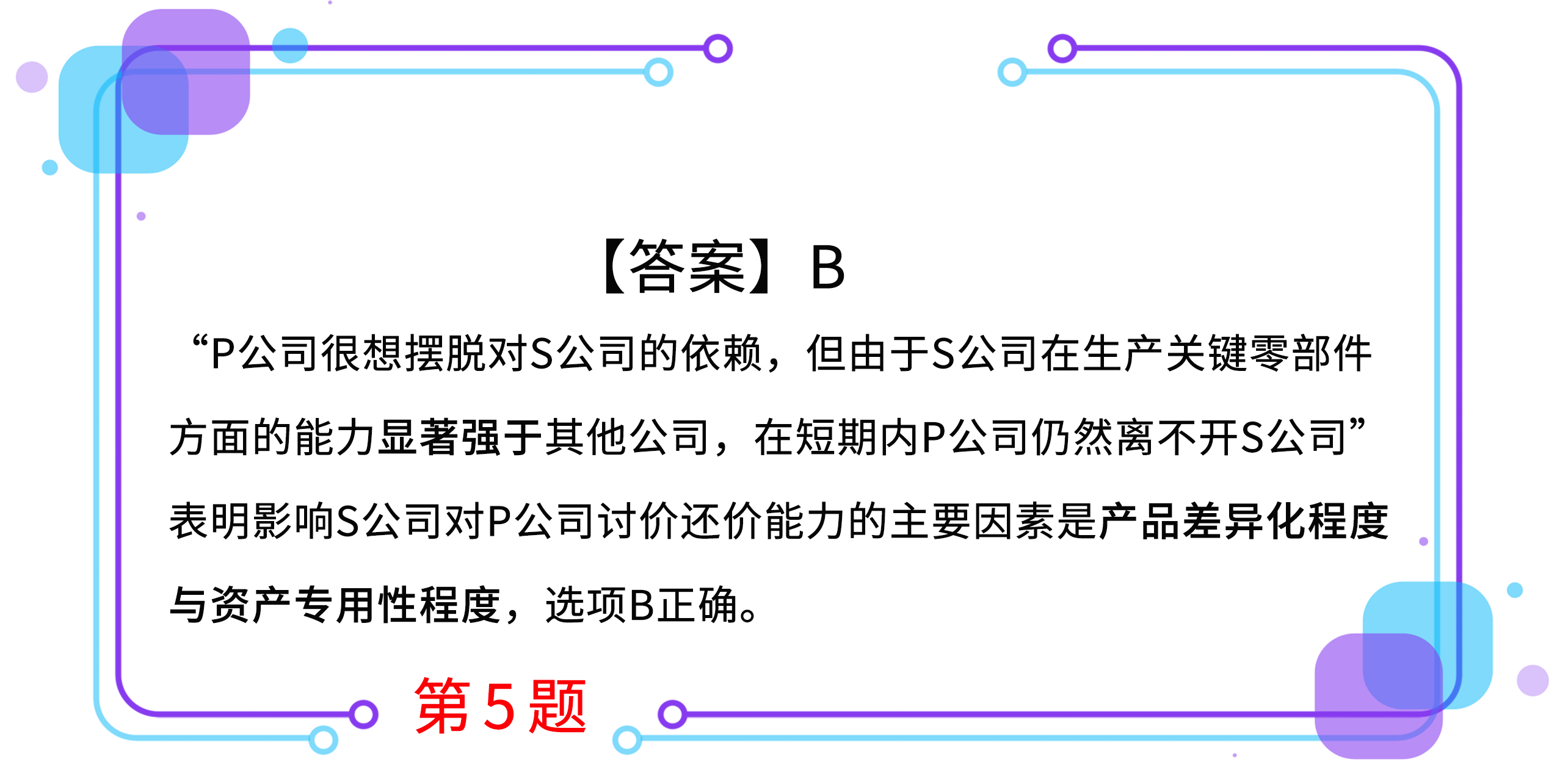 5.2007~2013年,S公司在作為P公司最大的元器件和閃存供應(yīng)商的同時(shí),推出了系列智能手機(jī)和平板電腦,成為P公司在智能手機(jī)和平板電腦市場(chǎng)主要的競(jìng)爭(zhēng)對(duì)手。P公司很想擺脫對(duì)S公司的依賴,但由于S公司在生產(chǎn)關(guān)鍵零部件方面的能力顯著強(qiáng)于其他公司,在短期內(nèi)P公司仍然離不開(kāi)S公司。這一案例中,影響S公司對(duì)P公司討價(jià)還價(jià)能力的主要因素是( )。(2017年)