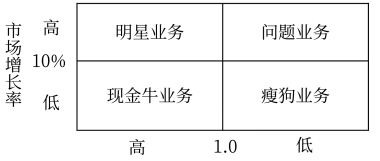 橫軸:相對市場占有率=企業(yè)某項業(yè)務的市場份額/這個市場上最大競爭對手的市場份額,通常用1.0作為相對市場占有率高(大于1.0)、低(小于1.0)的界限。相對市場占有率是決定企業(yè)業(yè)務結構是否合理的內在因素。