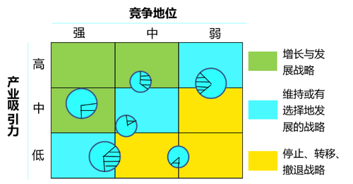 ①產業(yè)吸引力和競爭地位的值決定著企業(yè)某項業(yè)務在矩陣上的位置。矩陣中圓圈面積的大小與產業(yè)規(guī)模成正比,圈中扇形部分(畫線部分)表示企業(yè)在某項業(yè)務的市場占有率。