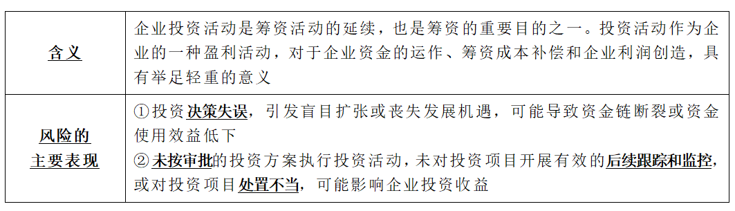 企業(yè)應對投資管理風險,應重點關注投資方案可行性論證、投資方案決策、投資方案實施、投資處置與會計系統(tǒng)控制等方面的管控措施。