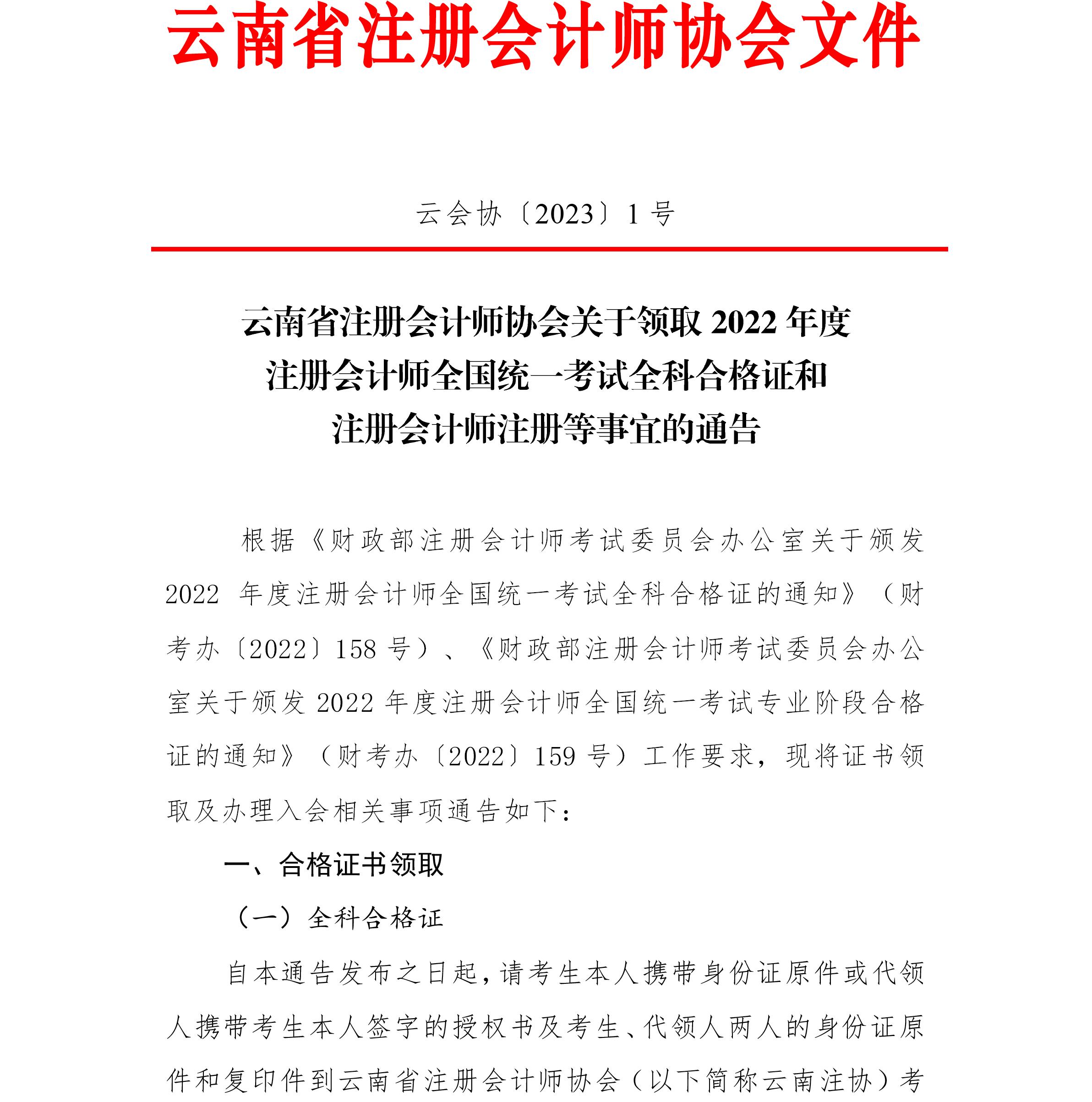 云南省發(fā)布關(guān)于領(lǐng)取2022年度注冊會(huì)計(jì)師全國統(tǒng)一考試全科合格證和注冊會(huì)計(jì)師注冊等事宜的通告
