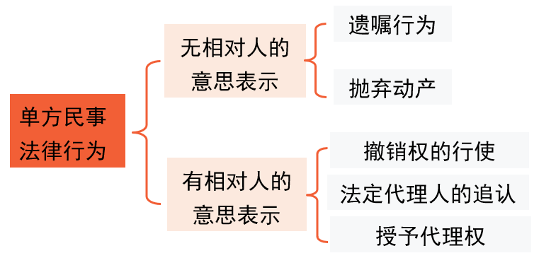 解釋:遺囑行為、拋棄動產(chǎn)等單方民事法律行為,屬于無相對人的意思表示。值得注意的是,并非所有的單方民事法律行為都屬于無相對人的意思表示,如撤銷權的行使、授予代理權、法定代理人的追認等單方民事法律行為,屬于有相對人的意思表示。