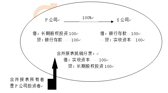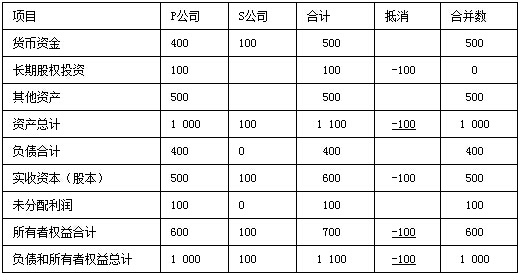、貾公司投出100萬(wàn)元貨幣資金形成S公司,作為企業(yè)集團(tuán)整體,相當(dāng)于貨幣資金100萬(wàn)元由一個(gè)賬戶轉(zhuǎn)入另一個(gè)賬戶,P公司個(gè)別財(cái)務(wù)報(bào)表中的長(zhǎng)期股權(quán)投資和S公司個(gè)別財(cái)務(wù)報(bào)表中的實(shí)收資本不應(yīng)存在,應(yīng)予抵消。