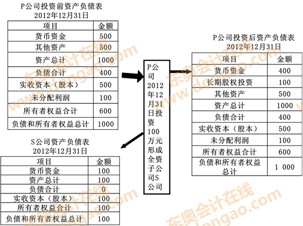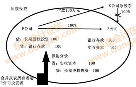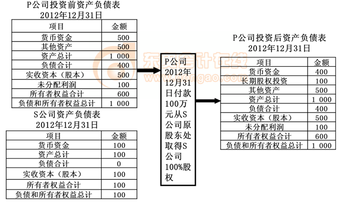 ②P公司投出100萬(wàn)元貨幣資金取得S公司股權(quán),即P公司向S公司原股東支付100萬(wàn)元貨幣資金,取得S公司原股東擁有的S公司股權(quán)。為簡(jiǎn)化,假定S公司資產(chǎn)負(fù)債表中只有銀行存款100萬(wàn)元,實(shí)收資本100萬(wàn)元。作為企業(yè)集團(tuán)整體,相當(dāng)于用100萬(wàn)元貨幣資金取得了S公司原有的資產(chǎn)和負(fù)債(即凈資產(chǎn)),P公司個(gè)別財(cái)務(wù)報(bào)表中的長(zhǎng)期股權(quán)投資和S公司個(gè)別財(cái)務(wù)報(bào)表中的所有者權(quán)益不應(yīng)存在,應(yīng)予抵消。