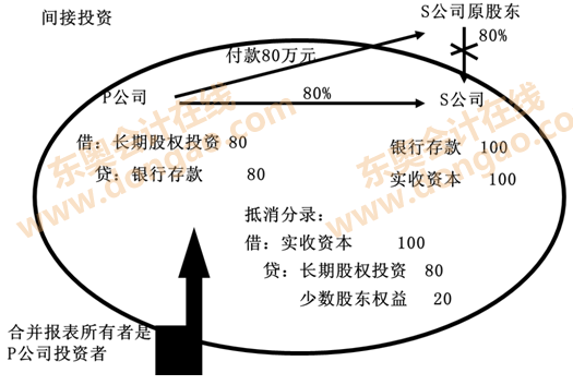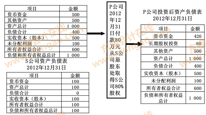 、跴公司投出80萬(wàn)元貨幣資金取得S公司80%股權(quán),即P公司向S公司原股東支付80萬(wàn)元貨幣資金,取得S公司原股東擁有的S公司80%股權(quán)。為簡(jiǎn)化,假定S公司資產(chǎn)負(fù)債表中只有銀行存款100萬(wàn)元,實(shí)收資本100萬(wàn)元。作為企業(yè)集團(tuán)整體,相當(dāng)于用80萬(wàn)元貨幣資金取得了S公司原有資產(chǎn)和負(fù)債的80%(即凈資產(chǎn)的80%)。在合并財(cái)務(wù)報(bào)表中,S公司的所有資產(chǎn)和負(fù)債都要全額反映,其凈資產(chǎn)的20%歸少數(shù)股東所有。因此,合并財(cái)務(wù)報(bào)表中P公司個(gè)別財(cái)務(wù)報(bào)表中的長(zhǎng)期股權(quán)投資和S公司個(gè)別財(cái)務(wù)報(bào)表中的所有者權(quán)益不應(yīng)存在,應(yīng)予抵消,并同時(shí)確認(rèn)少數(shù)股東權(quán)益。